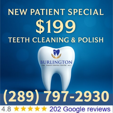 Burlington Family Dental Centre offers all new patients affordable teeth cleaning services for only $199 for a limited time. Additional cleaning maybe needed depending on how much plaque is on your teeth and how long it’s been since your last visit to a dental clinic. This includes teeth cleaning and polishing performed by our experienced dentists and dental hygienists.